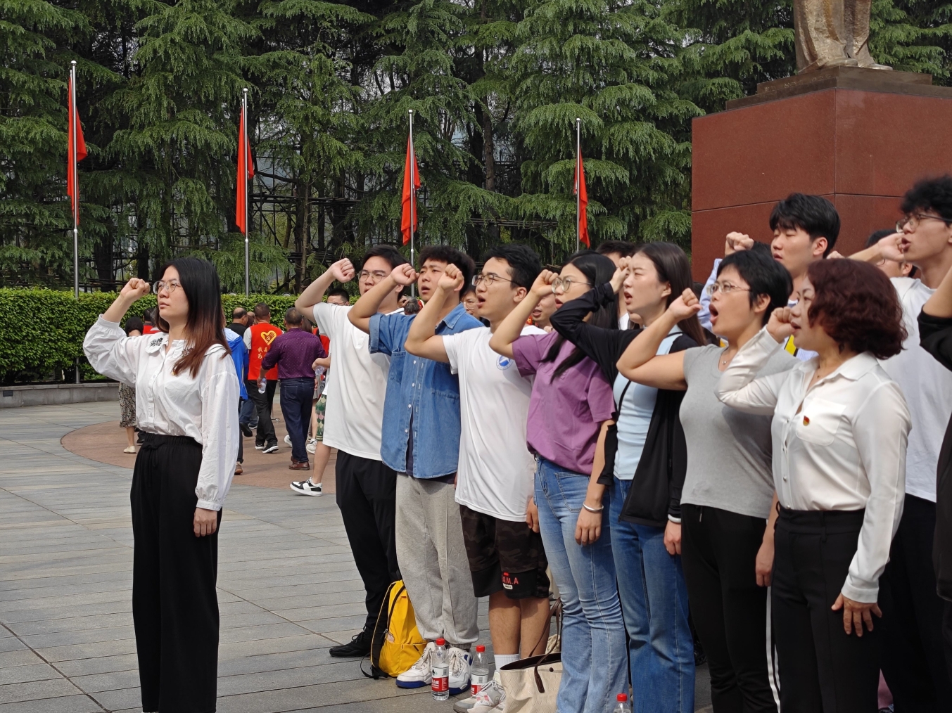 在毛泽东铜像广场,党员们肃立在毛泽东铜像前,面对鲜红的党旗,坚定地举起右手,重温入党誓词,庄重宣誓。铮铮的誓言回荡在广场上空,凝聚着党员们弘扬革命传统,担当新使命的初心。