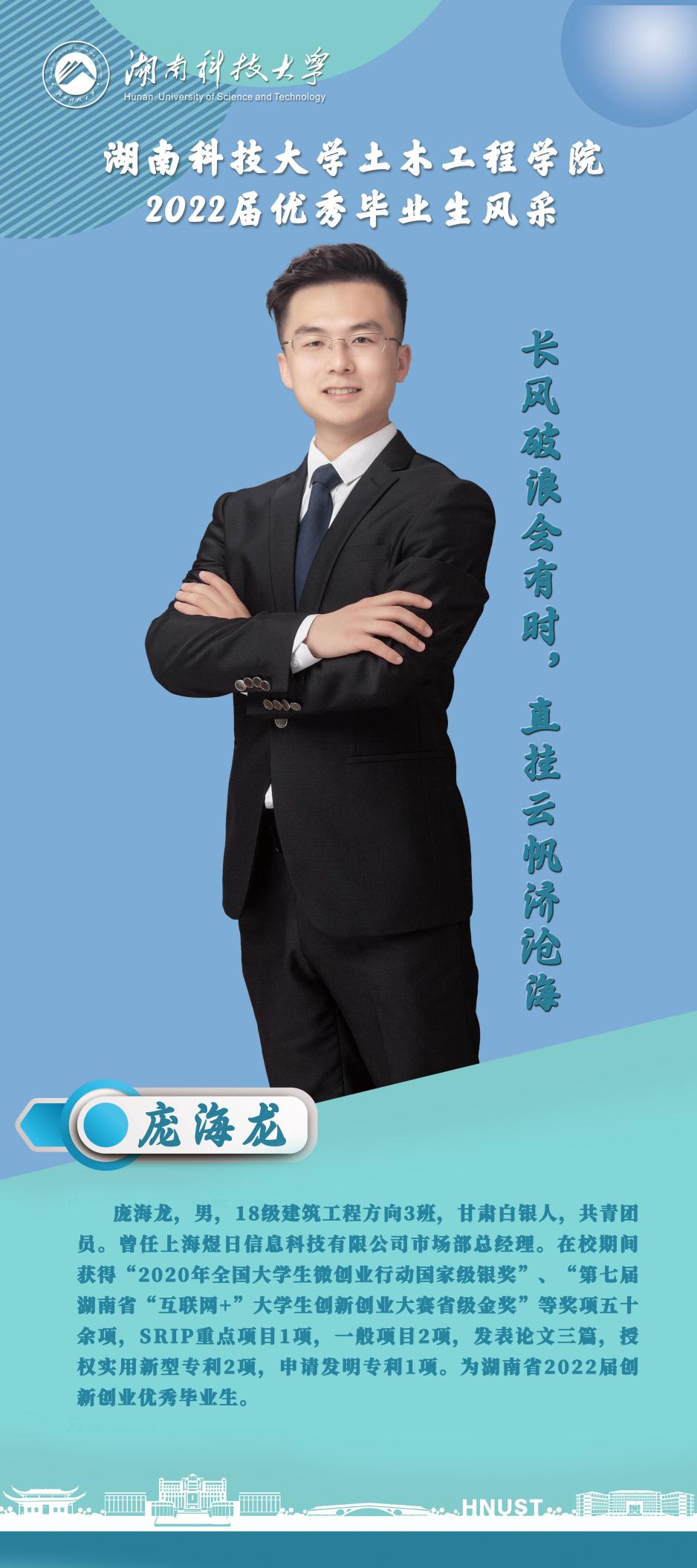 “长风破浪会有时,直挂云帆济沧海”,这是庞海龙的人生格言。大学四年,他不负青春,在学习、科研、工作上均取得了优异成绩。今后,他将再接再厉,不断地完善自我,努力成为一名优秀的工作者,做一个全面发展的社会主义建设者,做一个对国家、对社会有用的人。相信这些经历和积累都将成为他在人生道路上的宝贵财富。在以后的工作和学习中,庞海龙将继续保持并发扬严谨治学的作风,兢兢业业,争取取得更大的成绩。四年的锻炼,给他的仅是初步的经验积累,对于面对未来,迈向社会的他来说是远远不够的。因此,面对过去,他不负青春;面对现在,他努力拼搏;面对将来,他期待更多的挑战。他定将战胜困难,抓住每一个机遇,相信他一定会演绎出精彩的一幕!