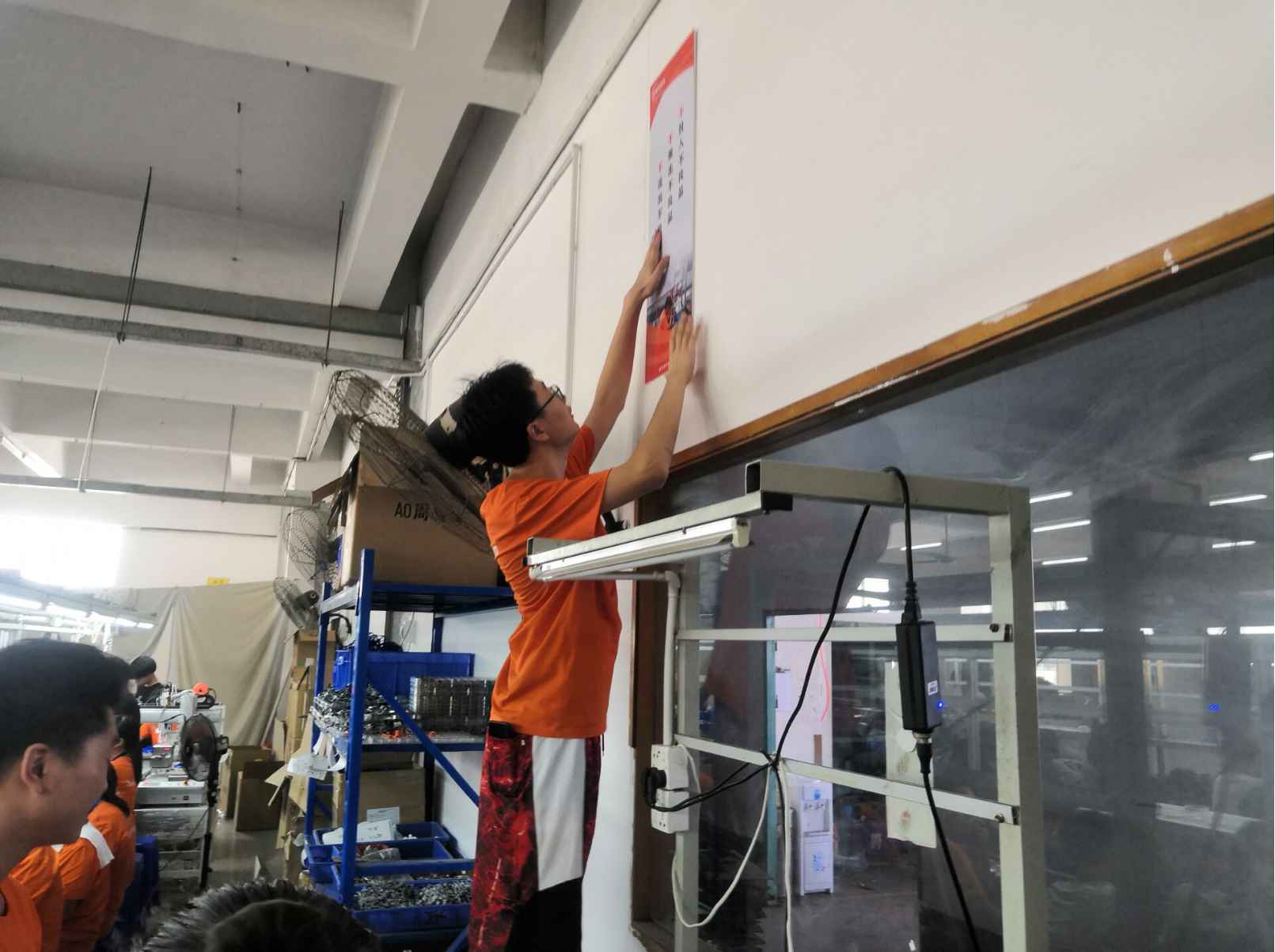 图为罗文亨为工厂张贴标语。罗文亨 提供