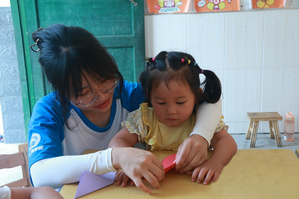 支教组开展了以“感恩“为主题的折纸教育课程,课堂上,志愿者们向孩子们介绍了即将制作的折纸作品,接着细致解说、反复演示地向孩子们讲解折纸步骤,孩子们聚精会神地学着,时不时举手向志愿者请教自己没学会的步骤。最后,志愿者为每位孩子分发了一支笔,并与孩子们一起在作品上写下他们想要感恩的人。志愿者与孩子们共处的时间除了在课堂中,还在课后与孩子们一起为篝火晚会排练节目,不仅能够一起上课,也能够一起玩耍,以促进孩子们全面发展。