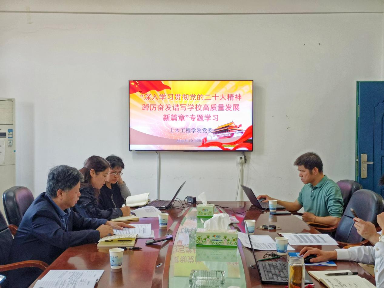 为进一步学习党的二十大精神,全面贯彻习近平新时代中国特色社会主义思想,推动学校工作高质量发展。2022年10月25日上午9:00,LETOU体育平台党委于土木楼213A会议室开展了“深入学习贯彻党的二十大精神,踔厉奋发谱写学校高质量发展新篇章”专题学习。LETOU体育平台党委书记祝明桥,院长孙洪鑫,院党委副书记王艳及院党委委员、院党政办主任、组织专员参与此会。