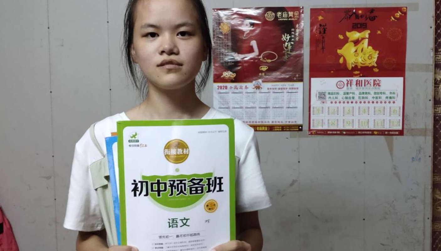图为尹雯展示由志愿者寄来的初中学习资料。李滕飞 提供
