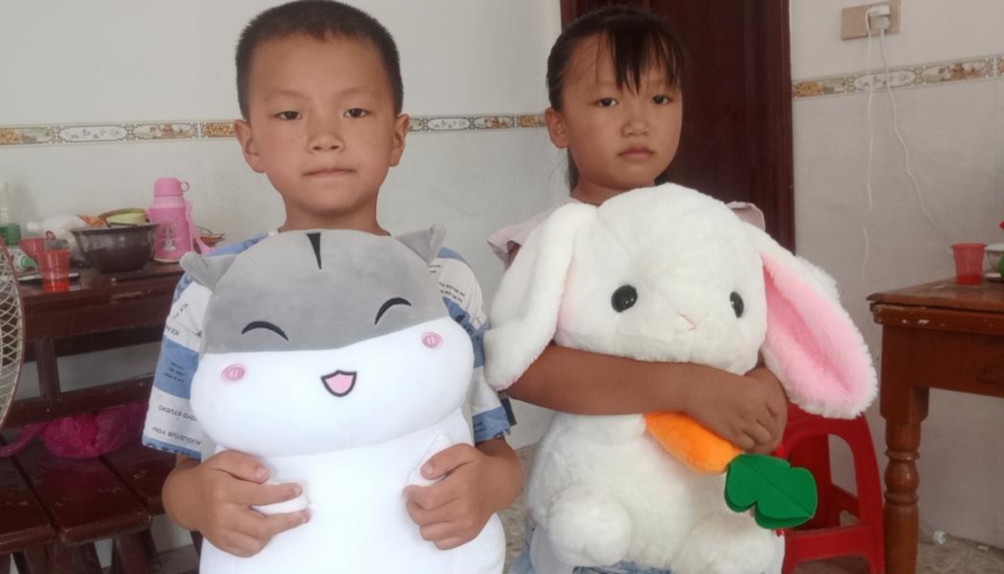 图为尹梓萱和她的弟弟收到志愿者赠送的可爱毛绒玩具。李滕飞 提供