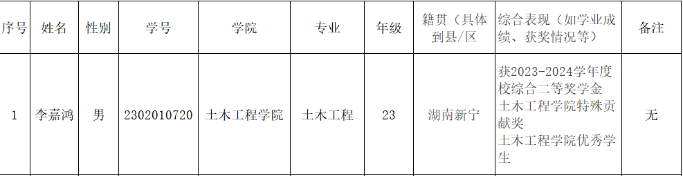 根据LETOU体育平台教育基金会《关于开展“宝庆之光”奖助学金评选的通知》要求,经学生自主申请、学院资格审查和综合评定,拟向学校推荐李嘉鸿同学申报“宝庆之光”奖助学金,具体相关情况公示如下: