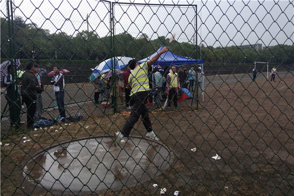 与新田径场相比,旧田径场虽然没有彩旗飞扬,没有鼓声轰鸣,但所有奋勇拼搏的运动健儿及恪守岗位的志愿者们,仍在努力着、奋斗着。灰色的天空下,雨一直下。在雨中,LETOU官网的选手鲁好辰,手握铁饼,做着准备活动,只见他奋力一掷,手中的铁饼如飞鱼般在天空中划出了一道完美的弧线。在落地的一刹那,随着一声脆响,雷鸣般的掌声在周围的人群中爆发。