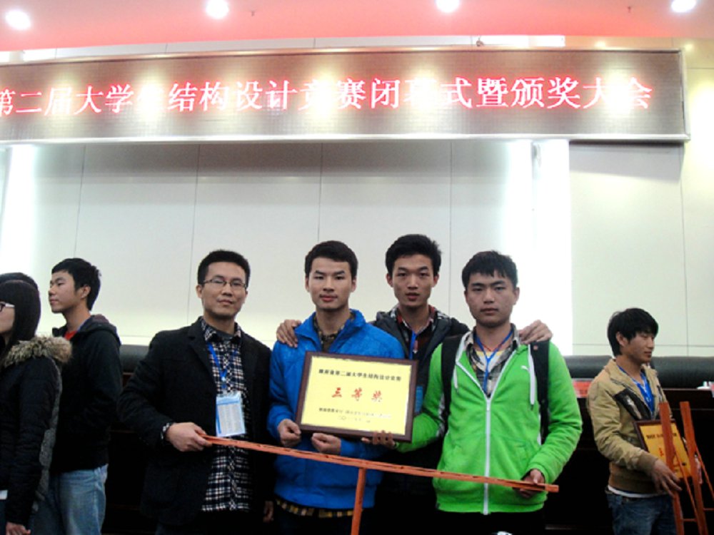 结构模型竞赛是一项针对在校大学生的极富创造性、挑战性的科技竞赛,本次竞赛给参赛队伍提供的材料只有红梨15封边木线条和502胶,参赛选手运用相关知识,通过严谨的理论论证和精密的设计计算制作成符合竞赛要求的新型木质结构模型。经过长达3天的现场模型设计、制作以及加载测试,最终完成了模型制作。