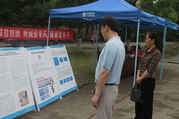 本次活动分为诚信教育展板、有奖知识问答和诚信条幅签名三个环节。展板分为三部分内容,分别对国家助学贷款、诚信教育和征信知识作了详细具体的说明,使同学们更加清楚生源地贷款的相关信息,了解个人征信系统在提高大学生信用意识和促进国家助学贷款政策实施方面的作用,认识到诚信对个人发展的重要影响,从而更加践行诚信,感恩还贷,做诚实守信、知恩图报的大学生。本次活动的最大亮点是有奖知识问答,其吸引来众多学生围观并积极参与,大范围传播了诚信知识,引发了同学们对诚信的深入探讨,加大了诚信教育和诚信考试的宣传。写着“创诚信校园,树诚信学风,做诚信学子”文字的条幅是本次诚信宣传最醒目的标志,易贵元和杨钋平亲自在上面签名,路过的学生也纷纷写上了自己的名字。每位同学都深知诚信乃立身之本,人无信则不立的道理,践行诚信才能获得他人的信任。