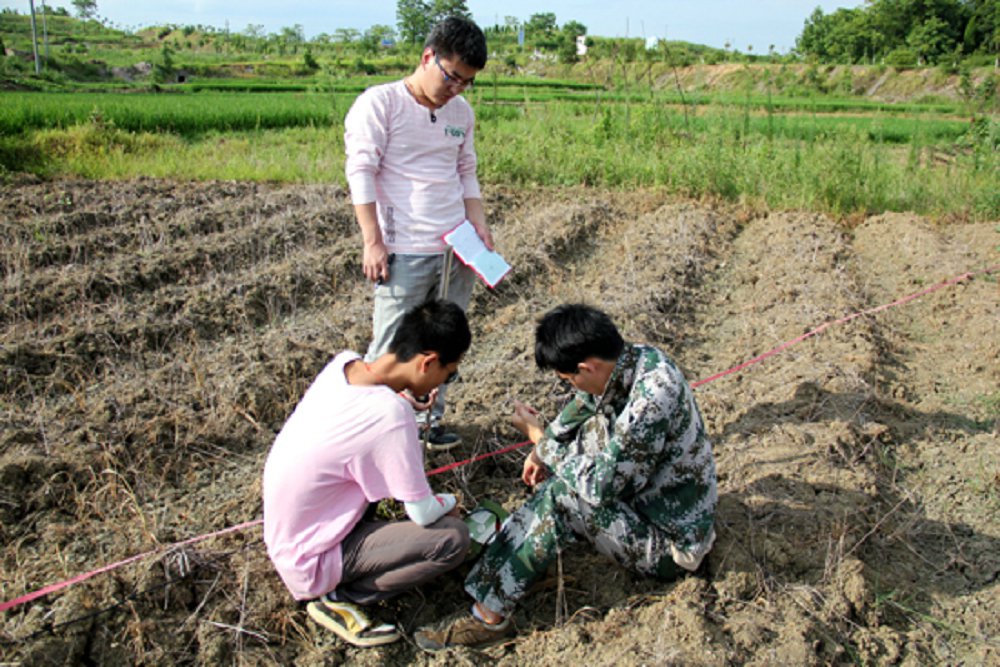 湖南省永州市新田县火里塘村是湖南省国土资源厅建设重点扶贫点,该村常年严重缺水,生活用水和农业用水常年得不到保障。找水小分队通过与村官、村民的交流,对当地的情况有了初步了解,然后把附近一片废弃的农田作为第一个测试点,接着他们陆续地把天然电场选频仪、电极、电线、皮尺等测量工具带到试验田。首先队长用皮尺圈定测量范围,其他队员各自负责自己的事情,有条不紊,不到半个小时,基本工作都已经完成。最重要的是数据采集环节,在烈日下,找水小分队面朝黄土背朝天,在每个测试点都认认真真的读数和记录数据,为了避免出现错误,小分队成员都会重复做一次试验,有时因为数据的波动性较大,会重复做更多次。在两个测试点之间,小分队队员们不厌其烦地重复同样的动作,汗水渐渐地浸透了他们的衣裳。通过他们的不懈努力,百分之八十的工作在中午之前已经完成。吃过午饭,休息一段时间后,小分队4点半再次出发前往火里塘村完成剩下百分之二十的工作。