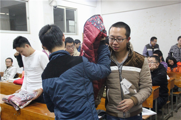 发放仪式开始后,赵老师亲自为每位贫困生发放棉衣。笑容和蔼,言语亲切的激励他们发奋图强。仪式结束后,赵老师和14的所有贫困生合影留念。