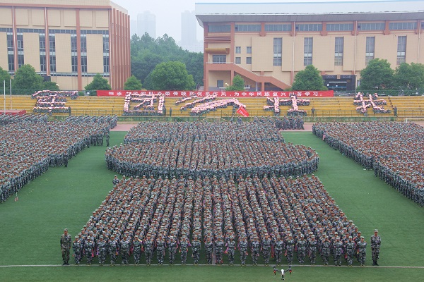大会的第一项是阅兵式,在激昂的乐曲声中,校长李伯超步入会场检阅军训队伍。“同学们好!”“校长好!”“同学们辛苦了!”“为科大争光!”受检阅的队伍队列整齐、士气高昂、口号嘹亮。接下来,分列式正式开始,各个方队依次通过主席台,接受学院领导和部队首长的检阅。此次阅兵共有19个学院20个方队接受检阅。整齐的步伐,昂扬的斗志,都体现着科大人的风采。随后是大会中最具特色的一项,伴随着倒计时,8300多名新生用枕头在操场上摆出10到1的数字和字母“HNUST”。他们井然有序的蹲下起立,最终定格在湖科校训“唯实惟新,至诚致志”字样、校徽以及数字“16”的画面。这一独具匠心的表演,体现了科大人的创新精神