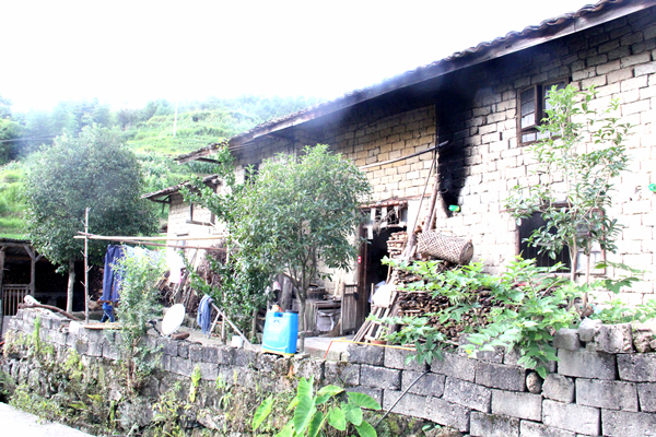 随后志愿者到山脚下一处老房子去探访。破败的围墙下,堆着满满的柴火和杂物,土墙上存留着厚厚的黑色烟熏痕迹。进入老房子,黄世伟的爷爷坐在光线黑暗的桌子旁,听说志愿者来了解黄世伟的基本生活情况,黄爷爷叹气地给我们说道:“这孩子苦呀!”。黄爷爷给志愿者说到,黄世伟之前一家在广东生活,去年因为爸爸因故去世后返回老家。现在他妈妈在增口乡一家制衣厂打工,他跟随爷爷一人生活,偶尔去陪妈妈生活。志愿者随后和黄世伟聊了聊,交代他一定要好好学习,在家里帮爷爷干些家务活。临走时,刘星老师资助了黄世伟一些钱,希望他能够健健康康的长大。