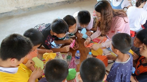 为了提升孩子们的动手能力,激发孩子们学习音乐的兴趣,培育孩子们的感恩之心,支教组开设了手工和音乐两种课程,并以此为媒介来进行感恩教学。上午,在早操和早读结束后,手工课正式开始了。彩色的纸片在志愿者手中不断飞舞、翻折,不一会儿就变成了美丽的千纸鹤。孩子们在台下拿着手中的彩纸跟着志愿者同步学习,最后他们也成功地用稚嫩的小手折出了美丽的作品。