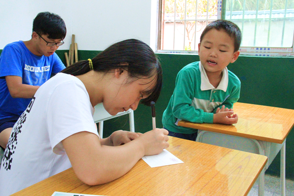 意识到和孩子们玩耍的时间不多了,志愿者们都希望在最后的时间内好好陪孩子们玩一玩。孩子们睁着大大的眼睛,略显紧张地问着:“老师,你们什么时候走?” “我们明天就走了。”经过这几天的相处,天真无邪的孩子们显然已经把志愿者当成了教学的老师,不仅辅导他们学习,还和他们一起玩耍。