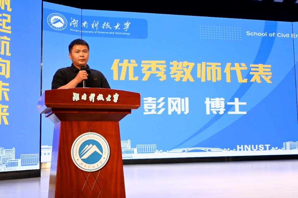 优秀青年教师代表彭刚寄语同学们在新的人生阶段需不懈努力,以“志存高远,不负韶华”“行积跬步,终至千里”“强健体魄、热爱生活”勉励新生,用努力与拼博书写未来的精彩篇章。