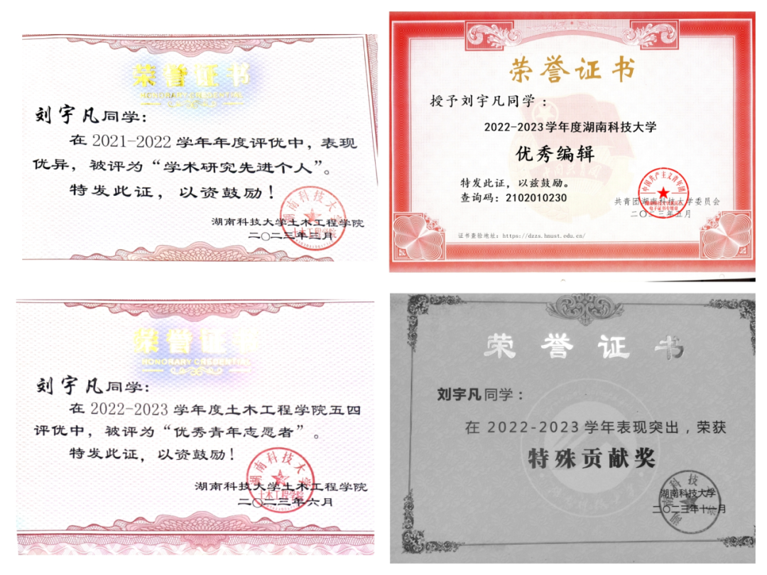 在求知的路上,她始终保持着脚踏实地的态度,在2021-2022学年中,综合学业成绩居专业前6%,2022-2023学年中,综合学业成绩居专业前8%。同时,为将所学知识与技能综合运用到实践中去,她积极参加各类竞赛,获得“镜头中的三下乡”优秀摄影团队、第五届国际大学生混凝土龙舟邀请赛优秀奖、习近平新时代中国特色社会主义思想研究性学习成果省二等奖、最美军训瞬间短视频大赛省三等奖、大学生企业运营仿真竞赛校一等奖、第十届结构设计竞赛校二等奖、校综合三等奖学金等十余项奖项。在年度评优和五四评优中先后获得“学术研究先进个人”“优秀青年志愿者”“科技创新先进个人”“优秀编辑”“优秀学生干部”“特殊贡献奖”等荣誉称号。