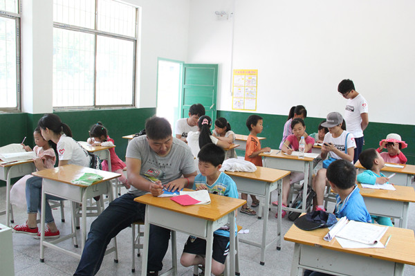 7月20日上午,刘星老师带领着志愿者从民居向白坪金兰联办小学出发。在志愿者们整理图书过后,学校附近的很多小学生带着暑假作业来到教室,作业中存在一些疑难问题,志愿者们都一一耐心地为他们解答。