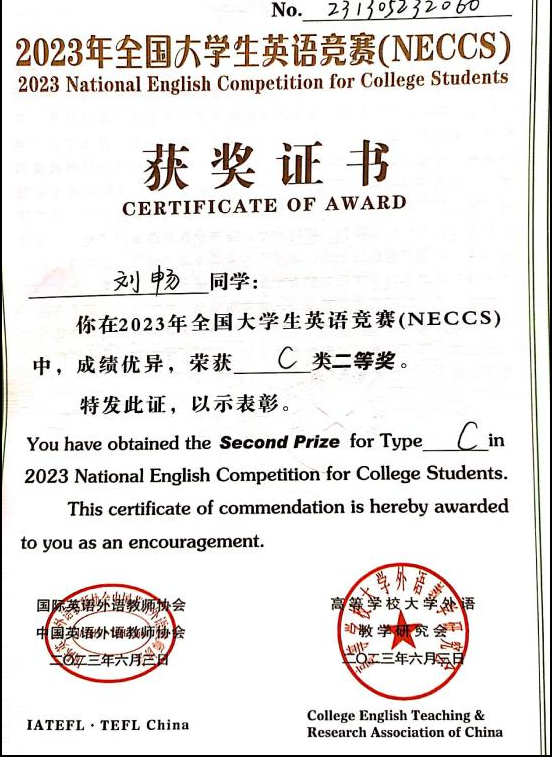 刘畅在学业上展现出顽强的拼搏精神。英语是她的优势学科,不仅以四级557分、六级526分的成绩高分通过考试,还荣获全国大学生英语竞赛二等奖。同时,她也认识到理科是自己的短板,为此,她不断摸索,掌握了预习、听课、课后巩固的学习方法。凭借坚持不懈的努力,她在大一学年成功逆袭,取得专业第三的好成绩。她用实际行动证明,只要有恒心、肯努力,就能突破自我,实现学业上的飞跃。