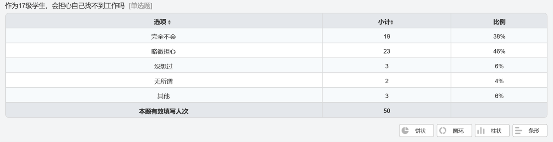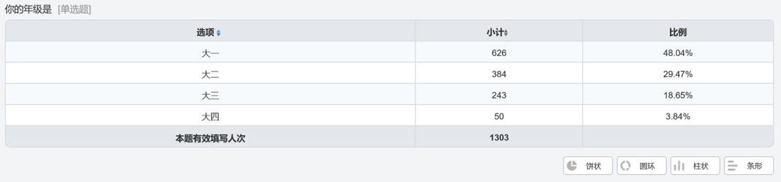 由于人数与各年级不符,考虑针对年级做的结论有效性偏低。工作过程中,各年级参与调查的积极性不能体现在报告中。经观察和访谈了解,及工作截图反馈,大一全程参与,大二学生对自己大二身份并无强烈意识,(考虑疫情的影响,做出了习惯性选择。