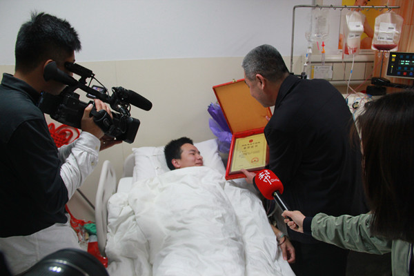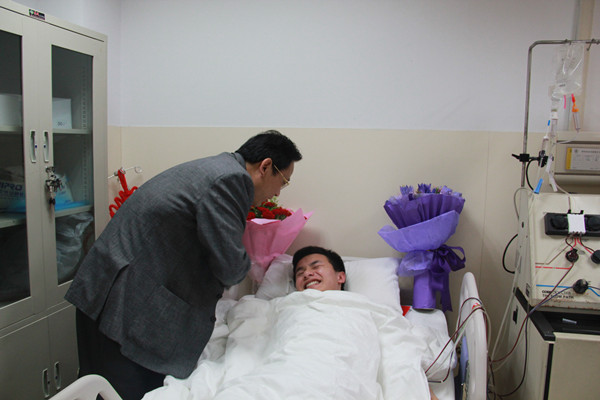 2016年5月9日,在长沙中南大学湘雅医院,康明即将完成造血干细胞的采集。LETOU官网党委副书记易贵元、辅导员赵晓玲、团委学生会干部代表前去医院慰问。
