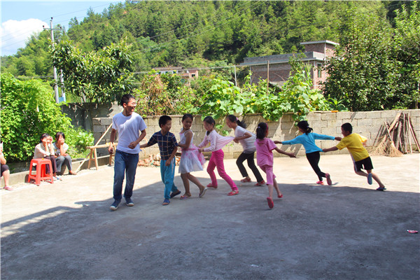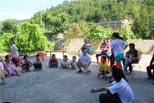 首先,小队成员与孩子们玩起了有趣的《丢手绢》游戏。在小队成员的积极带动之下,本来还有些羞涩的孩子也大胆的加入到了游戏当中,现场的氛围顿时高涨起来。接下来的游戏《老鹰捉小鸡》则将现场的氛围带到了高潮,被“老鹰”抓到的小朋友还为大家带来了自己的才艺表演,赢得了大家阵阵热烈的掌声。孩子的欢乐,可爱在游戏中被尽情的释放出来了。在与留守儿童一起游戏后,他们也跟我们建立了信任并且愿意跟我们聊天谈心。虽然现场的气氛是轻松而愉快的,但是这些外表坚强的孩子们还是不经意的流露出了自己心声。他们是如此的想念父母,他们多么的渴望父母能多陪陪自己,说到这里,不少孩子流下了眼泪。
