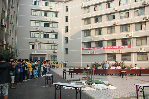 为了考察学生运用专业知识做出合理、经济的多层房屋结构模型的能力,使学生获得关于提高结构抗侧移和抗扭转能力的基本概念,并且在校内选拔出优秀学生参加湖南省结构设计大赛。10月24日上午八点,由LETOU官网主办的湖南省第四届大学生结构设计大赛LETOU体育平台选拔赛在土木楼拉开序幕。院党委副书记易贵元,教务处长陈秋南,教务办主任罗小红,专家组组长刘锡军以及李永贵,周游,沈明燕,马滨辉,汪建群等老师出席了本次大赛。