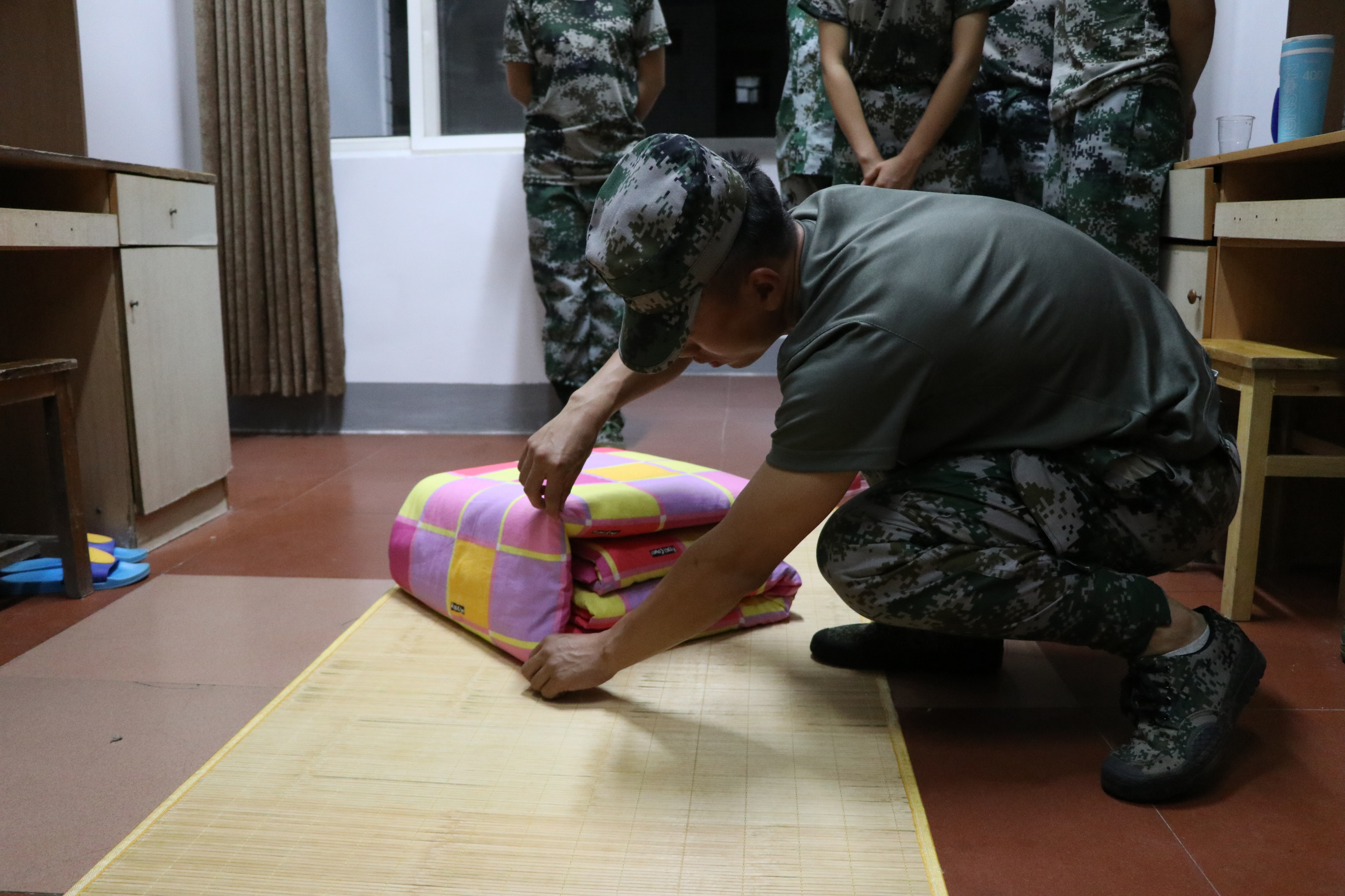 为了督促新生按标准整理内务,营造良好的寝室环境,教官下寝查看卫生。教官来到新生寝室指出不合要求的地方并亲自示范如何叠“豆腐块”。一天的训练结束了,同学们不仅学习到了不少军事技能,更深切感受军人的军纪之严,同时也培养了他们的团队意识,增强了同学们爱国爱校的热情和高度的社会责任感。