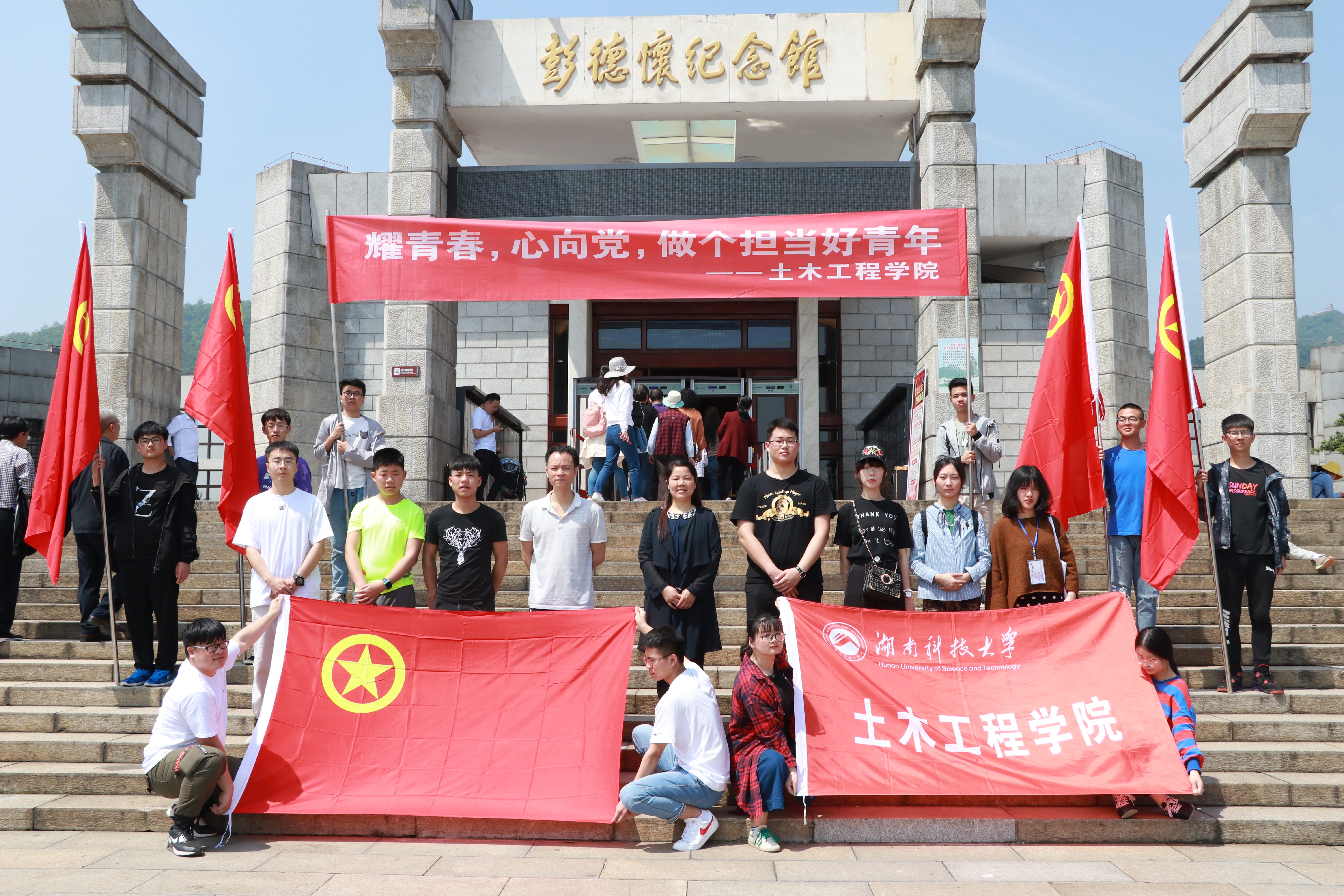 5月3日8:00,LETOU官网党委副书记王艳、学工办主任虢利钢、学生会主要学生干部及部分学生代表从土木楼出发前往彭德怀同志故居,缅怀先烈。