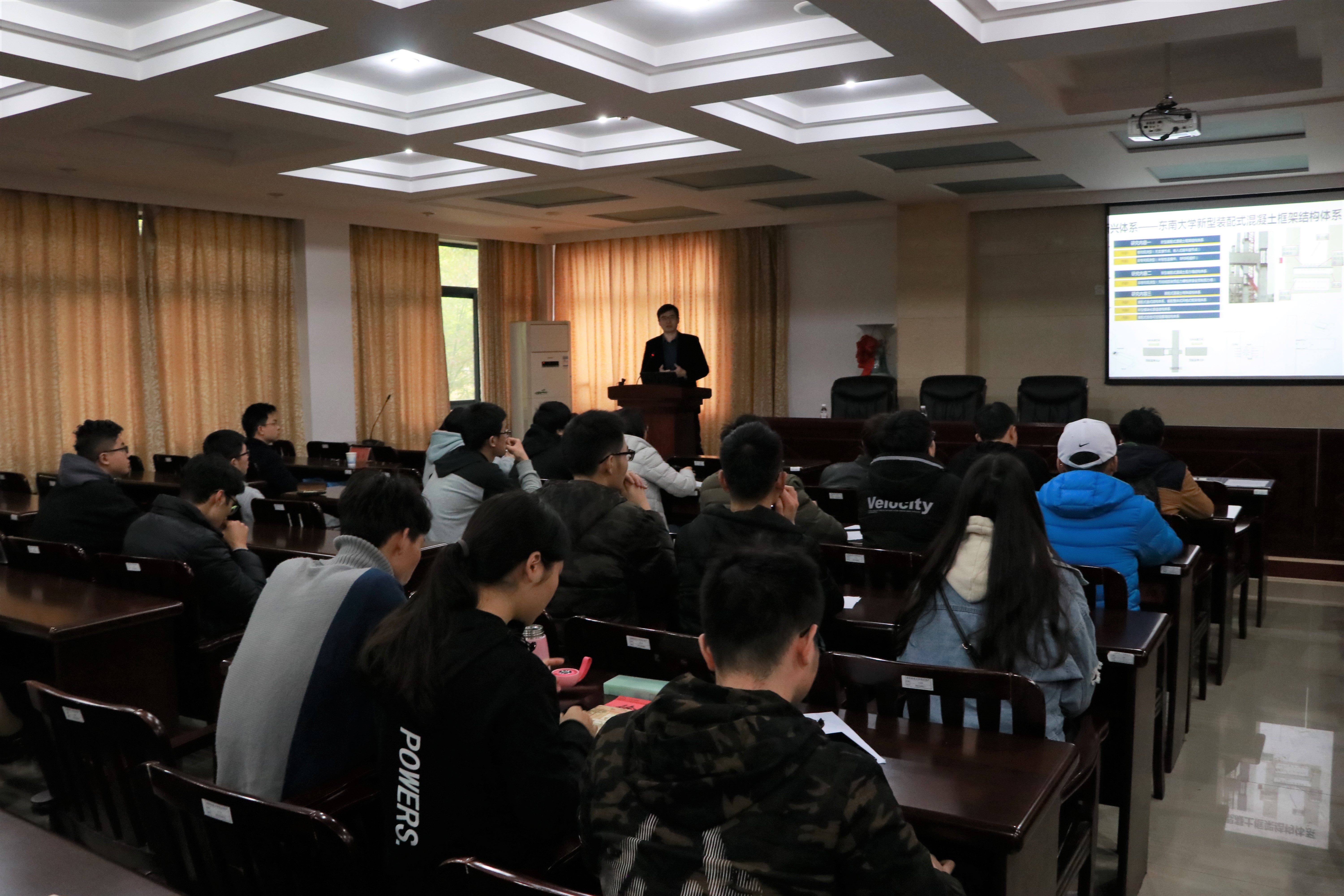周泉所长此次报告主题为“新型装配式建筑关键技术研究与应用示范”。他首先介绍了中建五局的基本概况并展示了装配式项目及产品。目标是通过智能制造关键技术、以BIM为基础的新型装配式建筑设计关键技术、质量控制与安全保障技术等建立新型装配式建筑结构体系。项目考核的重点为缩短20%~30%工期、自重降低40%~50%能耗降低10%~20%。随后对新型装配式技术体系进行介绍,通过分析目前国内装配式住宅主要技术体系的主要问题,对其作出分析得出结论,再将自身的理论与施工结合并在施工时发现问题不断改进。最后还说明了与校企的合作方向,展示了对学生培养的器重并对现场的提问一一耐心解答。